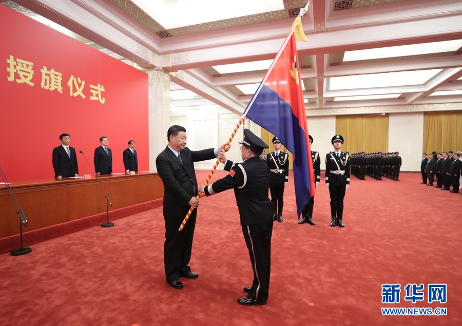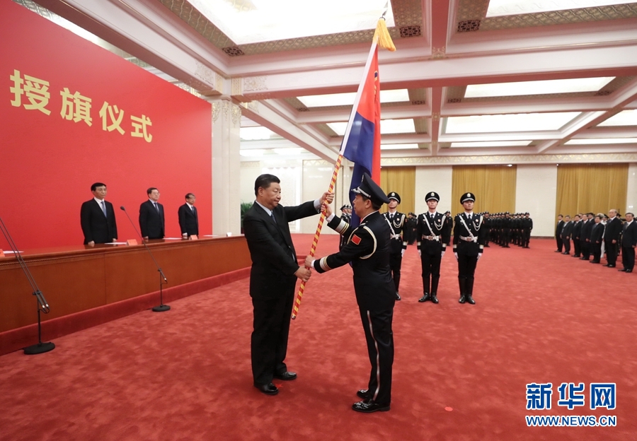 8月26日,中国人民警察警旗授旗仪式在人民大会堂举行。中共中央总书记、国家主席、中央军委主席习近平向中国人民警察队伍授旗并致训词。这是习近平向中国人民警察队伍授旗。新华社记者 鞠鹏 摄
