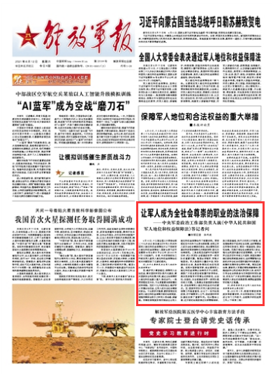 6月10日,十三届全国人大常委会第二十九次会议表决通过《中华人民共和国军人地位和权益保障法》(以下简称军人地位和权益保障法),国家主席习近平签署第86号主席令予以公布,自2021年8月1日起施行。日前,中央军委政治工作部负责人就军人地位和权益保障法的有关问题回答了记者的提问。