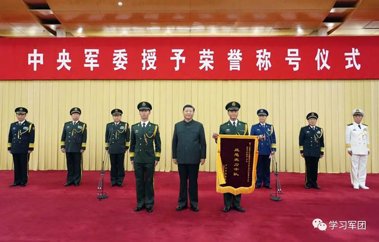 习近平向获得“反恐尖刀中队”荣誉称号的武警部队新疆维吾尔自治区总队某机动支队特战大队特战一中队颁授奖旗,并同该中队代表合影留念。