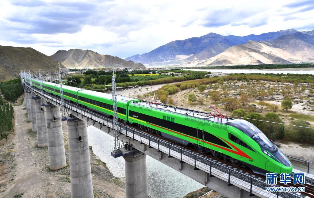 6月25日,全长435公里、设计时速160公里的拉林铁路建成通车,西藏首条电气化铁路建成,同时复兴号实现对31个省区市全覆盖。这是试运行的复兴号列车行驶在西藏山南市境内(6月16日摄)。新华社记者 觉果 摄