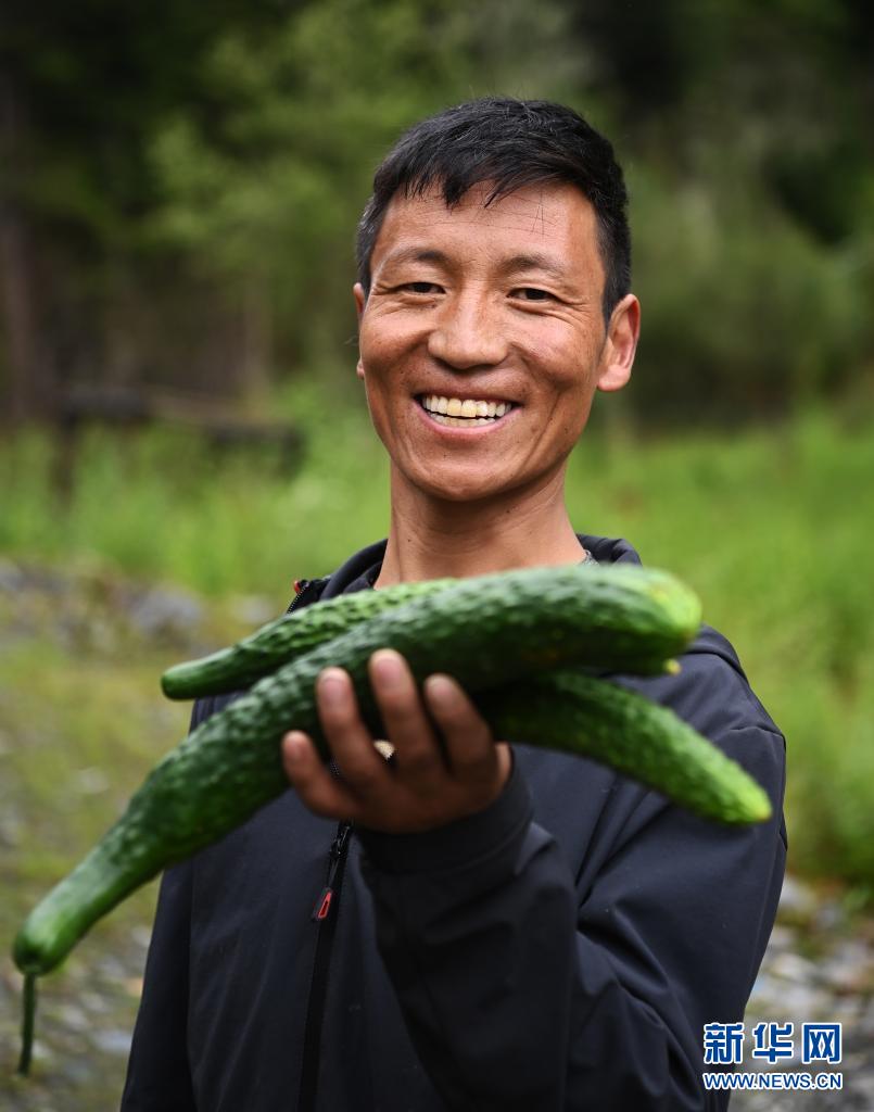 西藏山南市隆子县玉麦乡村民展示大棚里采摘的黄瓜,这些黄瓜将通过合作社销往各地(2020年7月30日摄)。新华社记者 普布扎西 摄