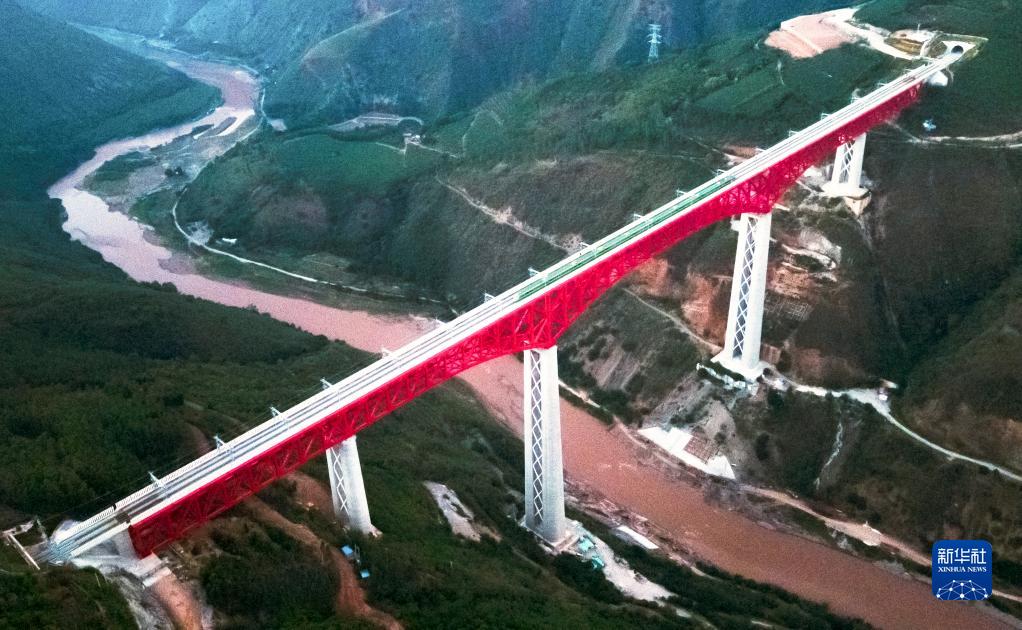 中老铁路首发列车驶过中国云南省元江哈尼族彝族傣族自治县境内的元江双线特大桥(12月3日摄,无人机照片)。新华社记者 王冠森 摄