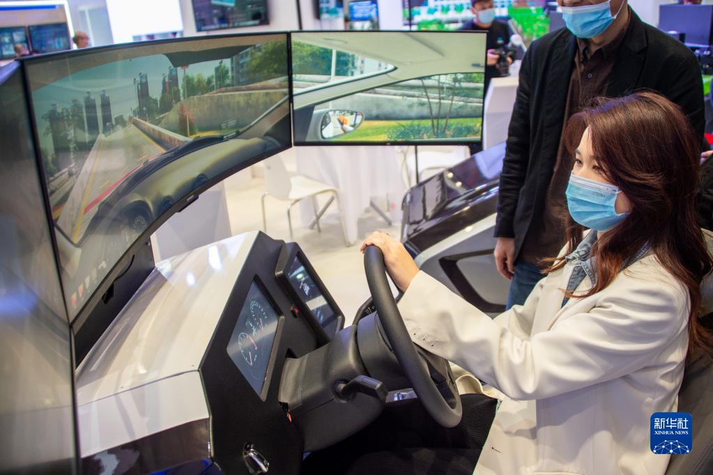 11月19日至21日,2021中国5G+工业互联网大会在位于武汉的中国光谷科技会展中心举行。这是11月19日,参观者在“5G+工业互联网成果展”上体验驾驶智能模拟器。新华社发(伍志尊 摄)