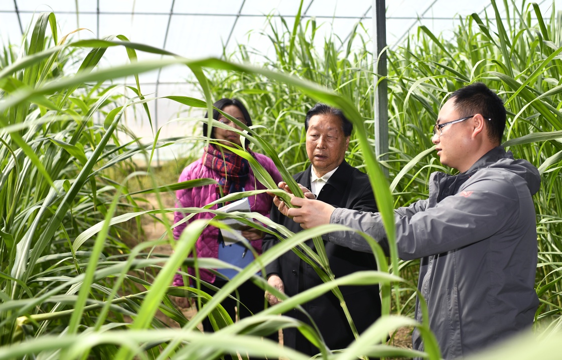 林占熺(中)在宁夏银川市永宁县闽宁镇农户刘昌富的大棚里查看菌草生长情况(2021年3月29日摄)。新华社记者 王鹏 摄