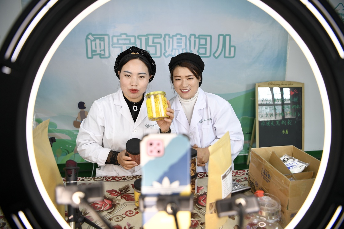 宁夏银川市永宁县闽宁镇闽宁禾美电商扶贫车间员工在直播带货(2020年11月11日摄)。新华社记者 冯开华 摄