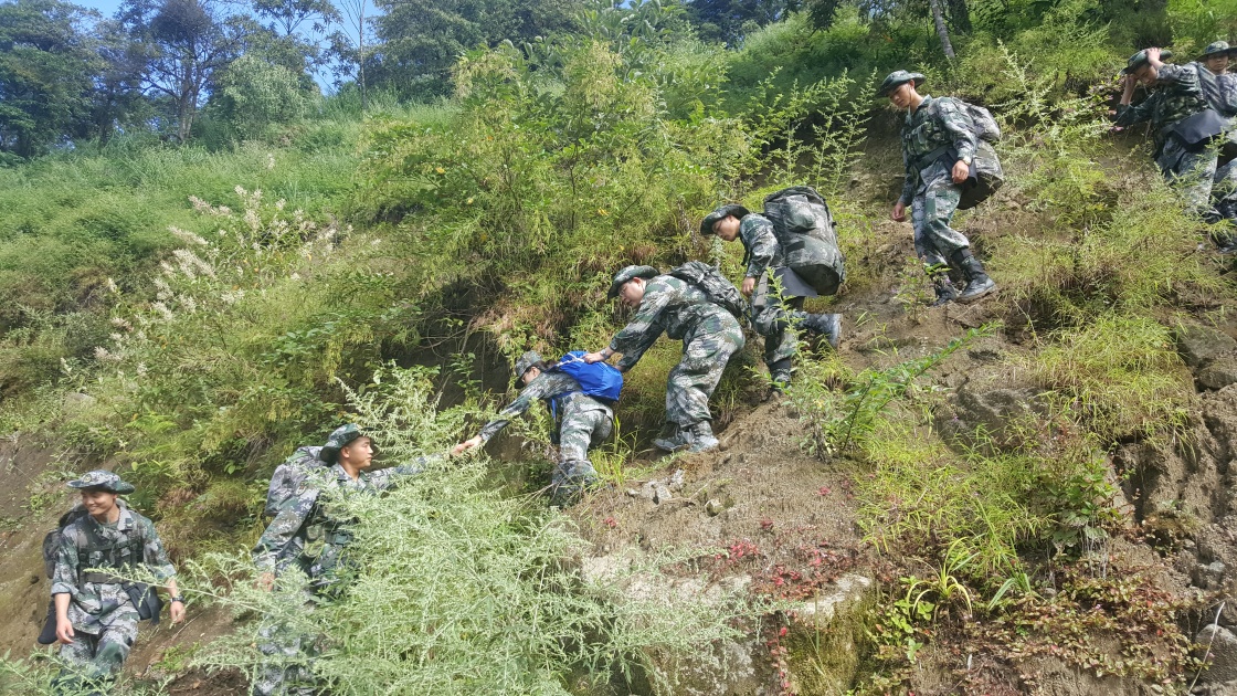 军事科学院系统工程研究院某研究所科研人员在西藏墨脱与边防战士一起参加徒步巡逻,实地了解军需保障需求(2017年9月16日摄)。新华社发(谢先达 摄)