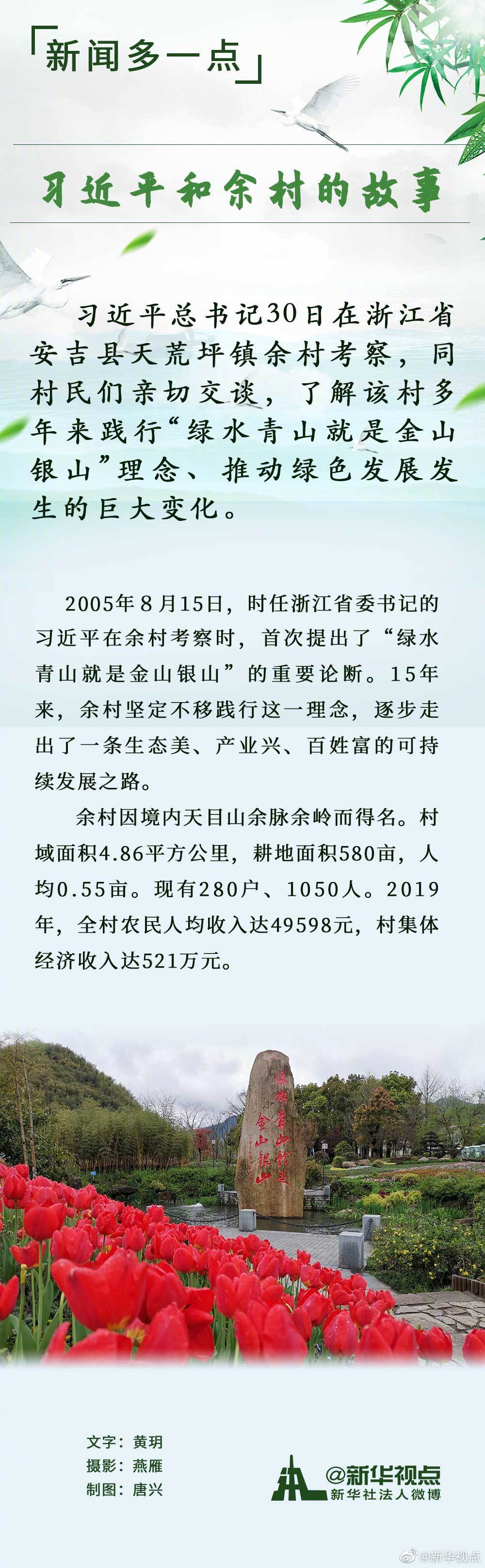 习近平总书记30日在浙江省安吉县天荒坪镇余村考察,同村民们亲切交谈,了解该村多年来践行“绿水青山就是金山银山”理念、推动绿色发展发生的巨大变化。随后,习近平前往安吉县社会矛盾纠纷调处化解中心调研,了解基层矛盾纠纷调解工作情况。