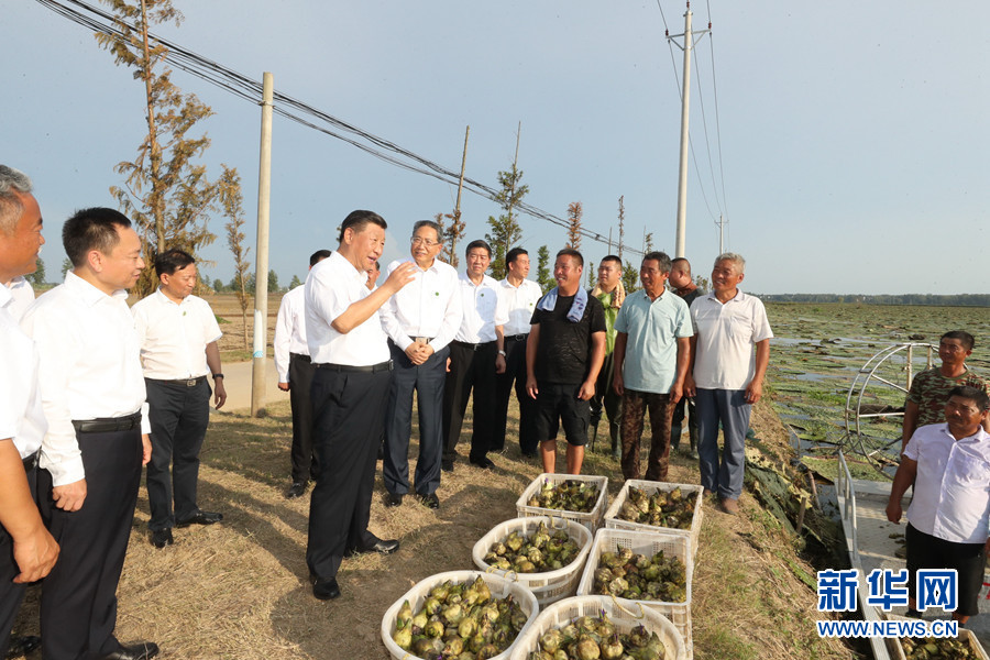 8月18日至21日,中共中央总书记、国家主席、中央军委主席习近平在安徽省考察。这是18日下午,习近平在阜阳市阜南县蒙洼蓄洪区,同正在采摘芡实的乡亲们亲切交流,了解灾后生产恢复情况。新华社记者 鞠鹏 摄