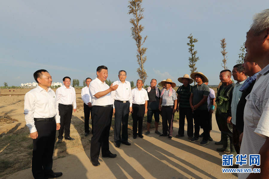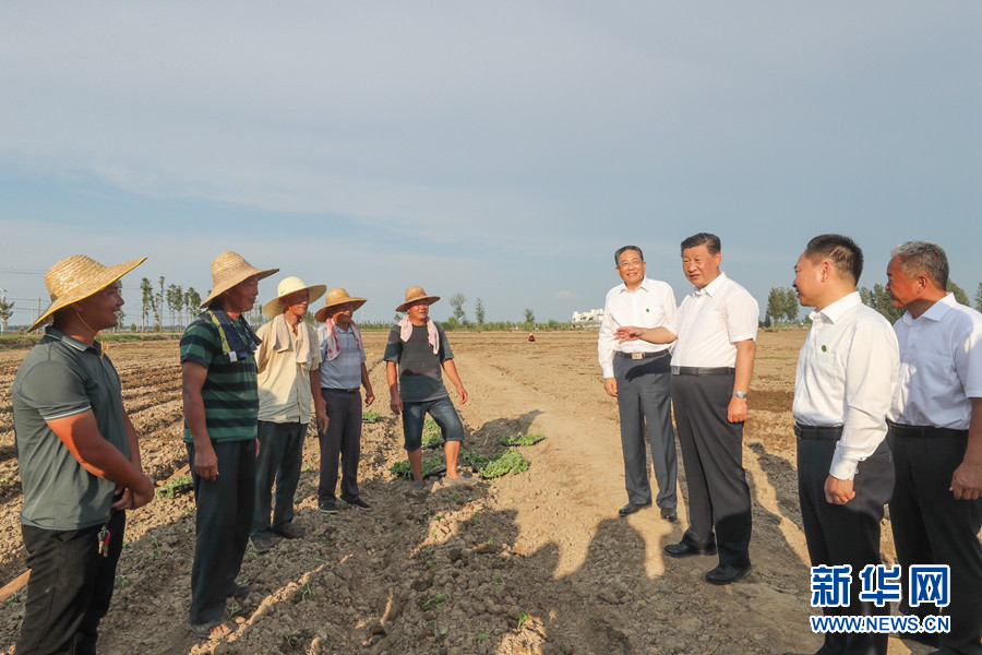 8月18日至21日,中共中央总书记、国家主席、中央军委主席习近平在安徽省考察。这是18日下午,习近平在阜阳市阜南县蒙洼蓄洪区,同正在退水地块补种蔬菜的乡亲们亲切交流。新华社记者 鞠鹏 摄