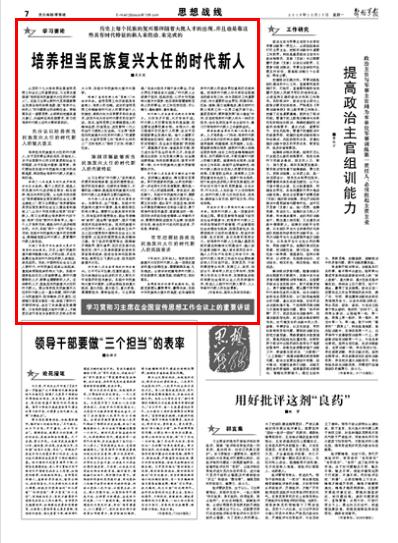 从党的十九大报告到全国宣传思想工作会议上的重要讲话,习主席反复强调“培养担当民族复兴大任的时代新人”。这是习主席从新时代党和国家事业发展全局的战略高度,就“培养什么样的人”的问题提出的战略任务。贯彻落实这一重要思想,必须深刻把握其重大意义、内涵特征和实践要求,努力把培养时代新人这件大事抓紧抓好。请关注今日出版的《解放军报》的文章——