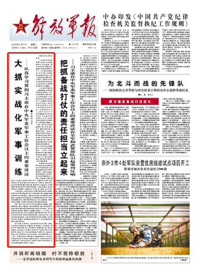 习主席在中央军委军事工作会议上的重要讲话中,突出强调 “要大抓实战化军事训练,提高练兵备战质量和水平”。习主席的重要讲话,充分凸显了军事训练的独特地位作用,立起了练兵备战的鲜明导向,必将进一步激发全军实战化军事训练的积极性主动性创造性,全面提高我军新时代打赢能力。请关注今日《解放军报》的报道——