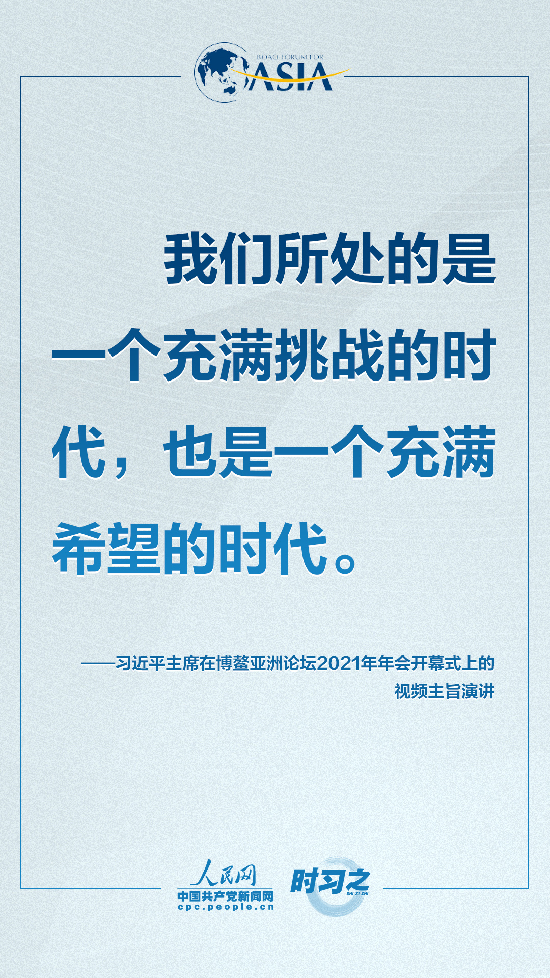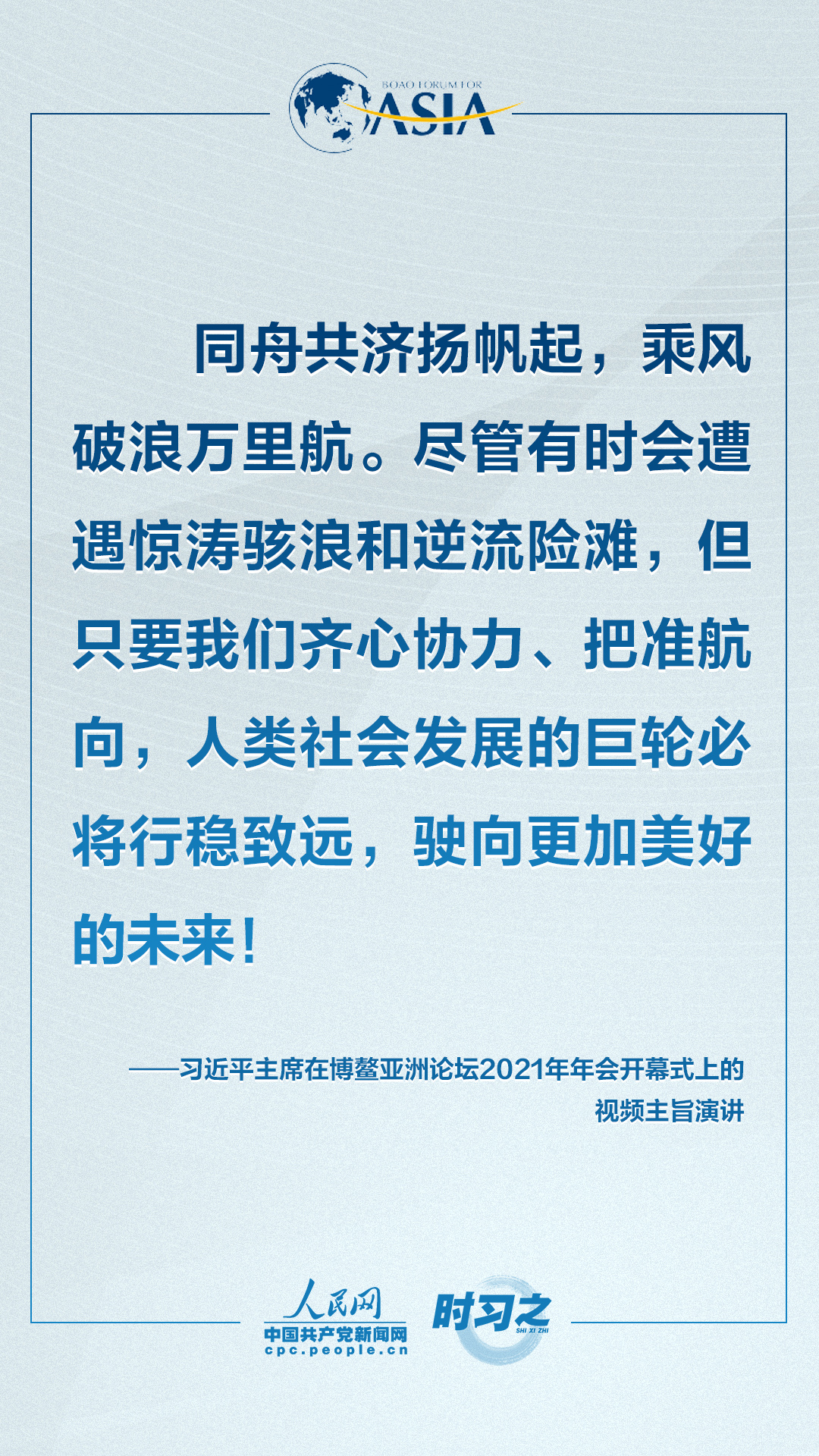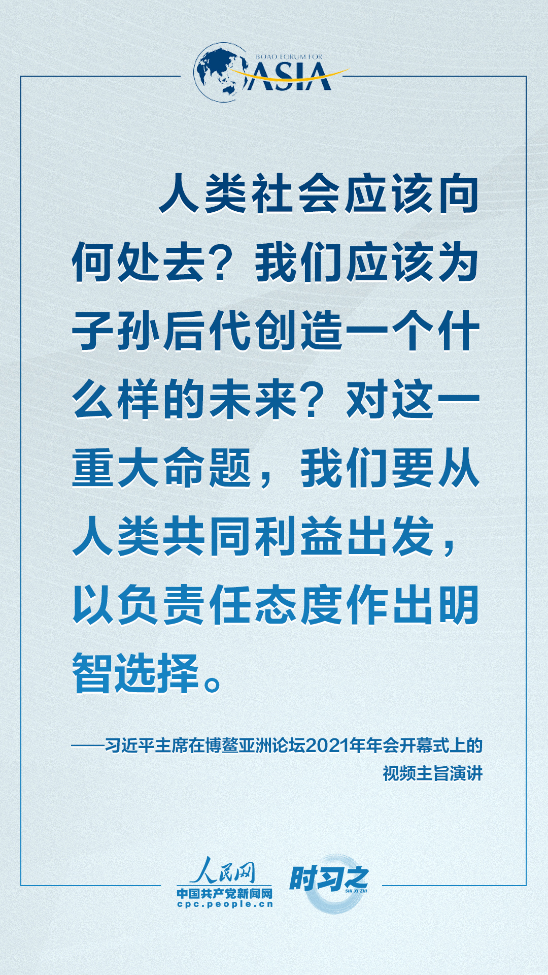 4月20日上午,博鳌亚洲论坛2021年年会开幕式在海南博鳌举行,国家主席习近平以视频方式发表题为《同舟共济克时艰,命运与共创未来》的主旨演讲。面对“人类社会应该向何处去?我们应该为子孙后代创造一个什么样的未来?”的重大命题,习近平这样对世界说。