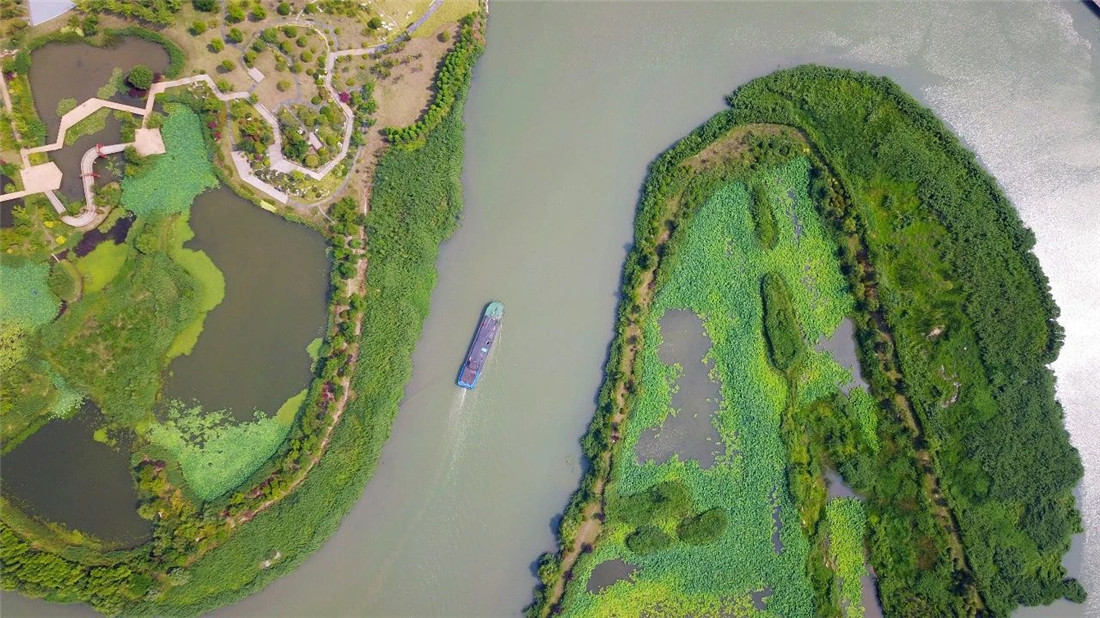 △2019年6月10日,江苏扬州,航拍运河三湾风景区绿意盎然,美不胜收。(图/视觉中国)
