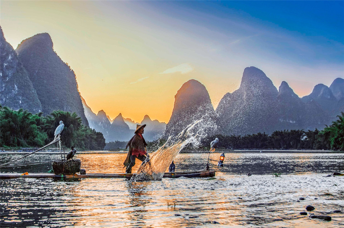 △2018年10月28日,广西阳朔,漓江打渔翁打起阵阵水花。(图/视觉中国)