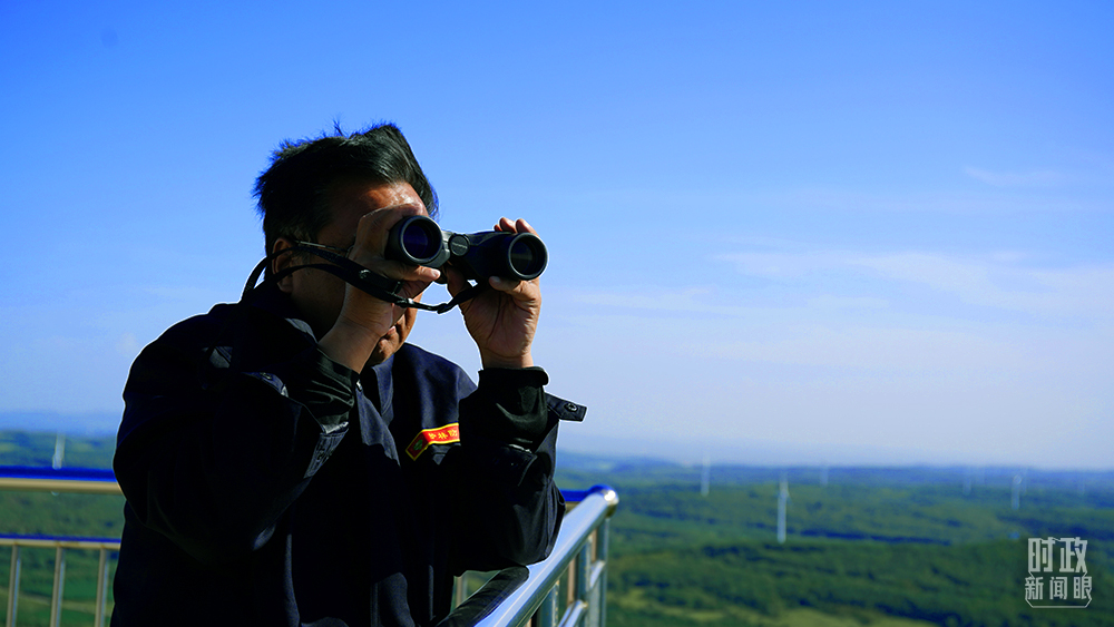 △防火瞭望员于成,自2001年起就在塞罕坝蔡木山值守,白天每隔15分钟瞭望、记录并报告一次。(总台央广记者潘毅拍摄)