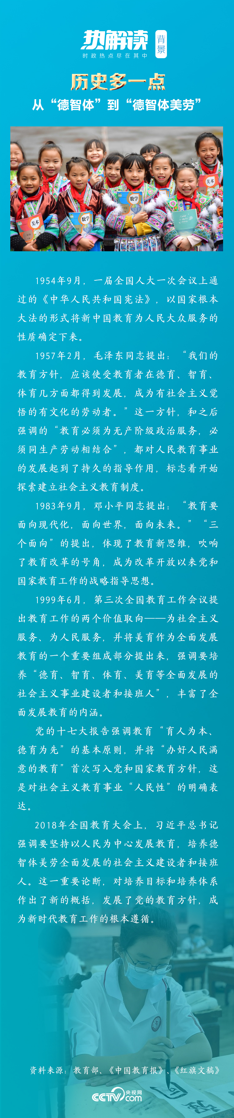 从毛泽东同志提出使受教育者在德育、智育、体育几方面都得到发展,到习近平总书记强调“培养德智体美劳全面发展的社会主义建设者和接班人”,都是中国共产党在不同时期对“培养什么人”这一根本问题的深邃思考。