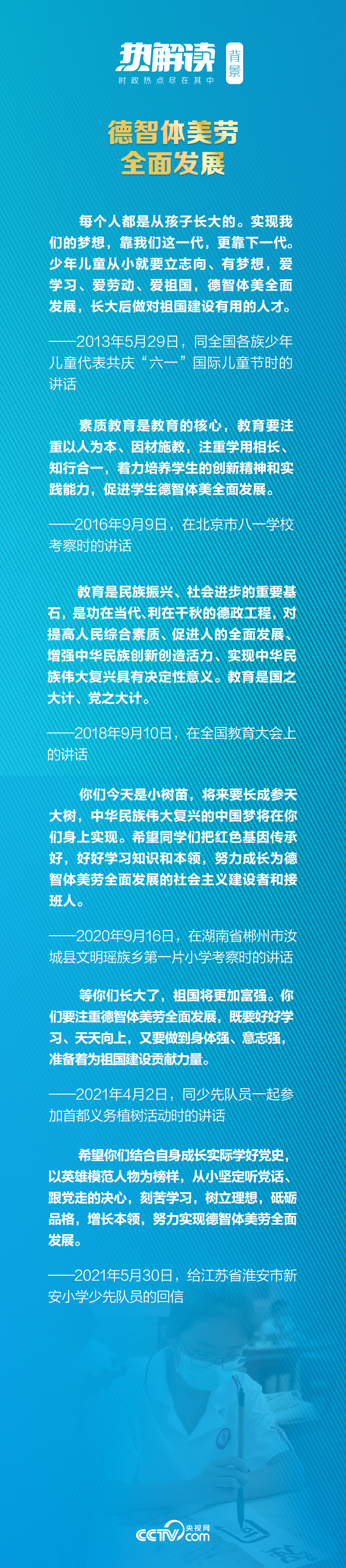 勉励青年学子“人生的扣子从一开始就要扣好”;为青年取得的成就和成绩点赞、喝彩;告诉小球员体育对陶冶性情、历练意志有重要作用;给中央美院老教授回信强调美育的重要性;要求“呵护好孩子的眼睛”;提出“让孩子们跑起来”“文明其精神,野蛮其体魄”……这都是习近平总书记对下一代的真挚关怀,也是对“接班人”的殷切期望。