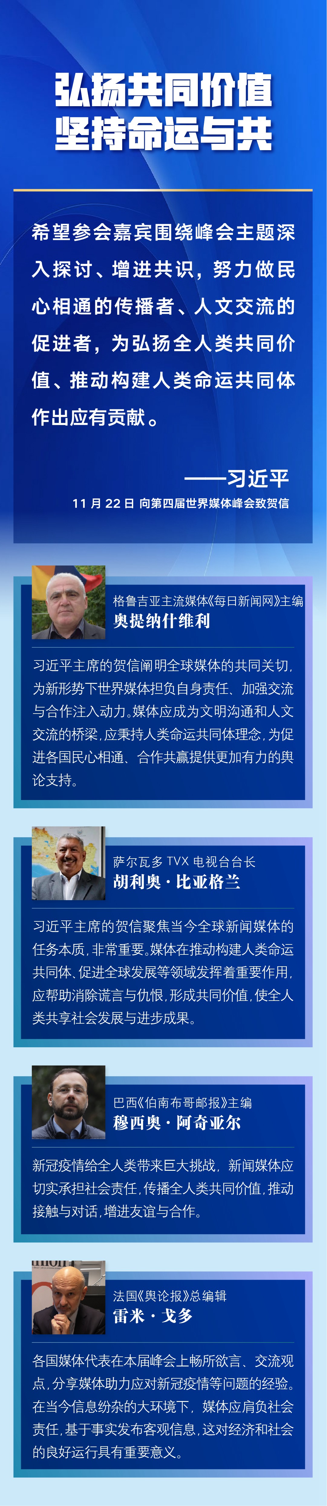 多国媒体人士认为,习近平主席的贺信对全球媒体更好肩负社会责任、广泛凝聚世界共识作出重要阐述,为新形势下世界媒体加强交流与合作、弘扬全人类共同价值、推动构建人类命运共同体注入新的推动力——