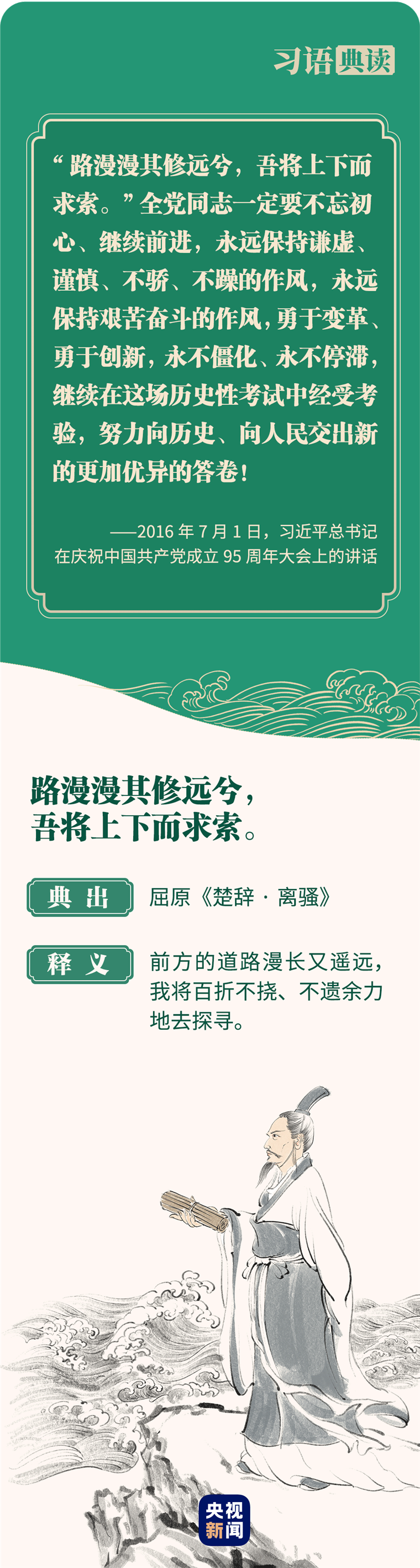 “路漫漫其修远兮,吾将上下而求索。”党的十八大以来,习近平总书记多次引用屈原的名句,鼓舞和激励全党全国各族人民勇于变革、勇于创新,风雨无阻、勇敢前进。