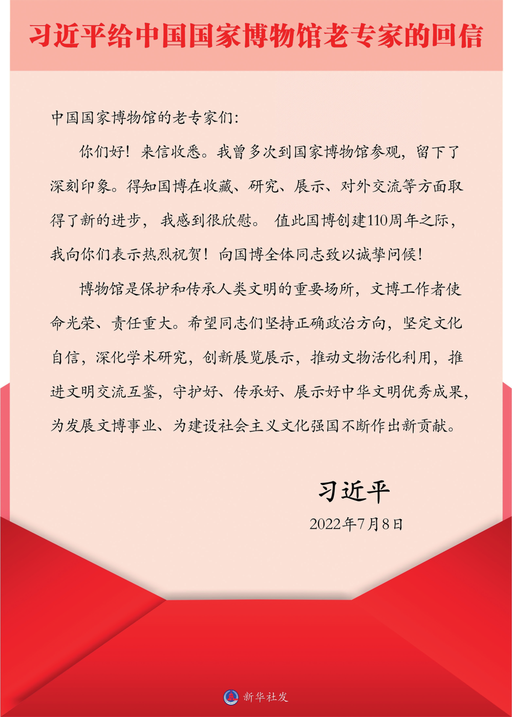 7月8日,中共中央总书记、国家主席、中央军委主席习近平给中国国家博物馆的老专家回信,在国博创建110周年之际,向国博全体同志致以热烈祝贺和诚挚问候。