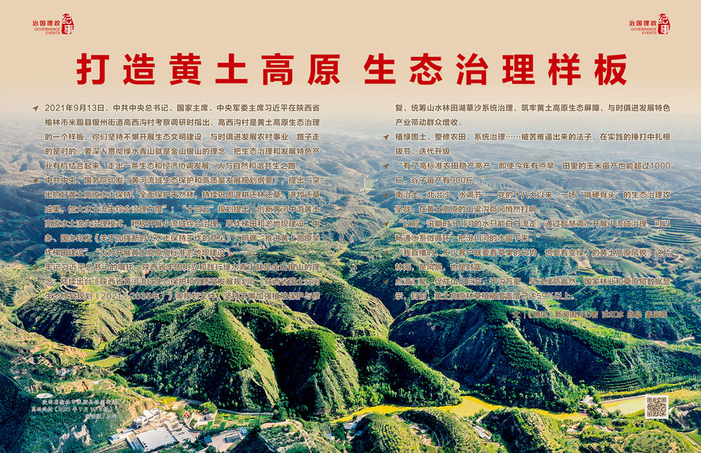 ◇2021年9月13日,中共中央总书记、国家主席、中央军委主席习近平在陕西省榆林市米脂县银州街道高西沟村考察调研时指出,高西沟村是黄土高原生态治理的一个样板,你们坚持不懈开展生态文明建设、与时俱进发展农村事业,路子走的是对的。要深入贯彻绿水青山就是金山银山的理念,把生态治理和发展特色产业有机结合起来,走出一条生态和经济协调发展、人与自然和谐共生之路。