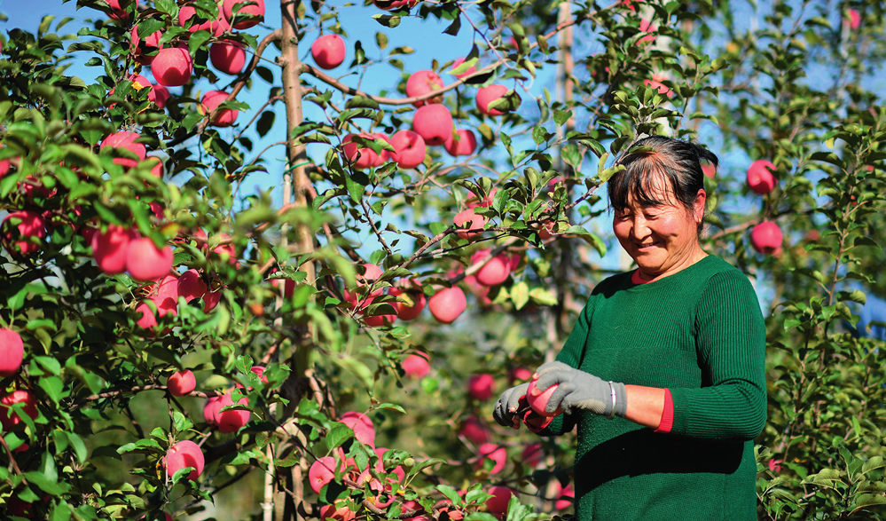 果农在陕西延安市洛川县永乡镇阿寺村一处果园采摘苹果(2022 年 10 月 10 日摄) 张博文摄 / 《瞭望》