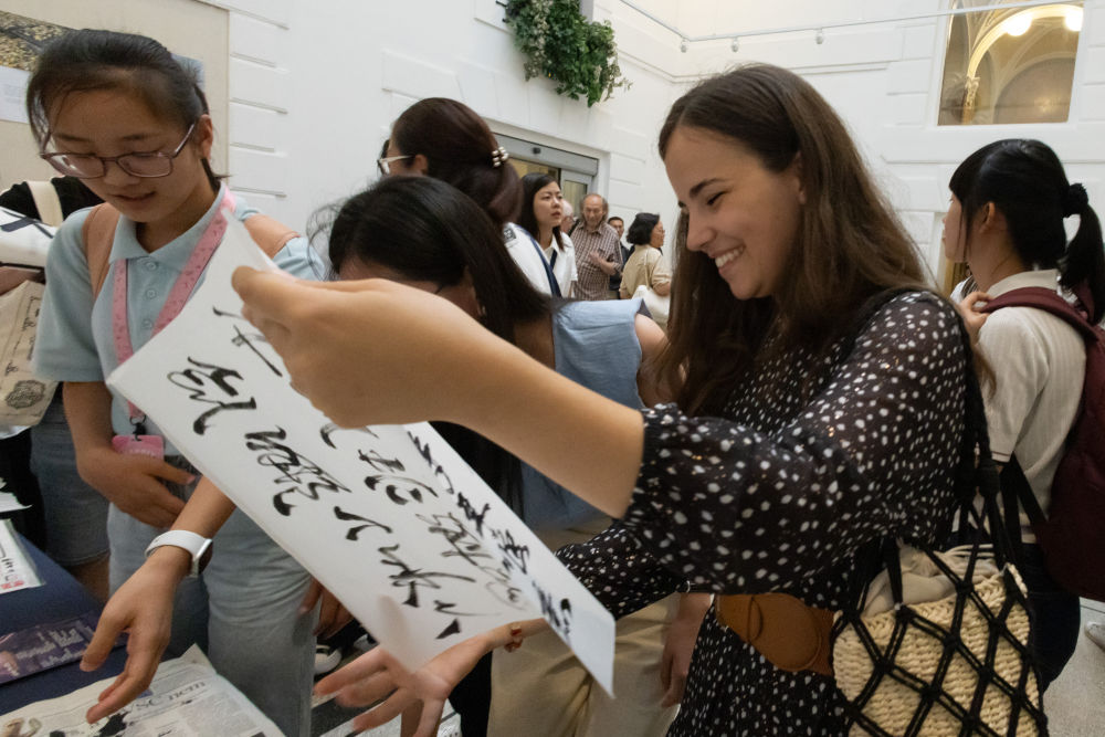 2023年8月29日,嘉宾在匈牙利布达佩斯“美美与共——中国匈牙利诗歌吟诵会”暨“汉字与中华文明”展上体验中国书法。