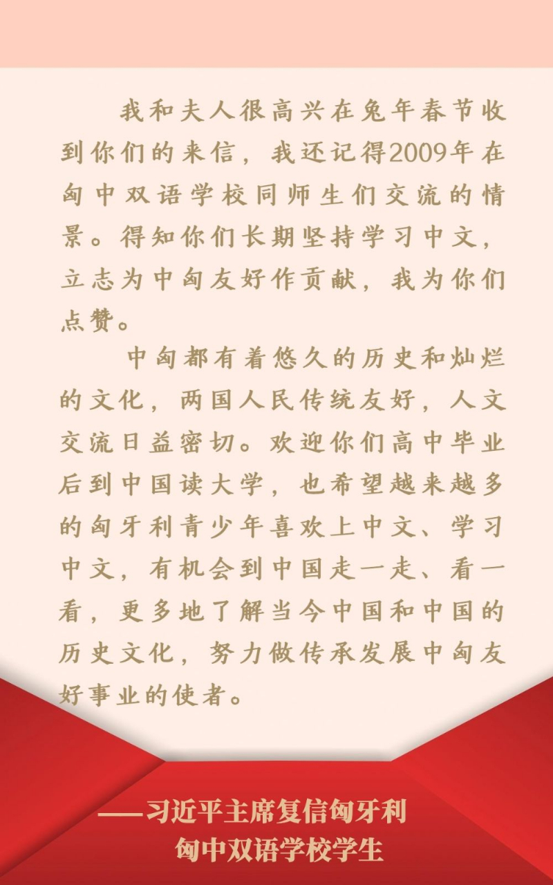 习近平主席在复信中鼓励匈牙利青少年更多了解中国,做传承发展中匈友好事业的使者。这封情真意切的回信,令匈中双语学校师生倍感温暖和鼓舞。
