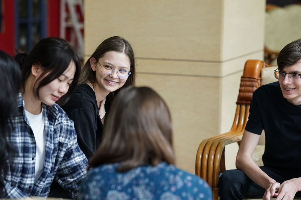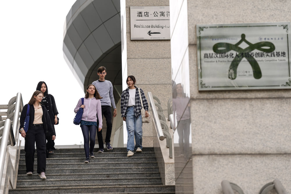 宋智孝(左二)在北京首都师范大学校园内与同学交流(2024年4月28日摄)。