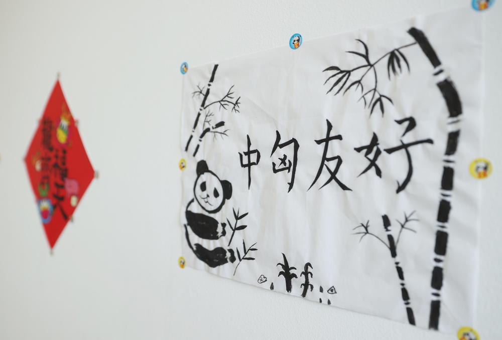 写有“中匈友好”的小朋友画作贴在匈中双语学校教室墙上(2024年5月3日摄)。