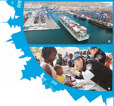 上图:中国远洋海运集团接手的希腊比雷埃夫斯港,成为海上丝绸之路的耀眼明珠。帕诺斯·托马达基斯摄(新华社发);下图:2017年12月28日,在利比里亚蒙罗维亚,中国维和警察防暴队医疗人员为儿童做口腔检查。赵小新摄(新华社发)