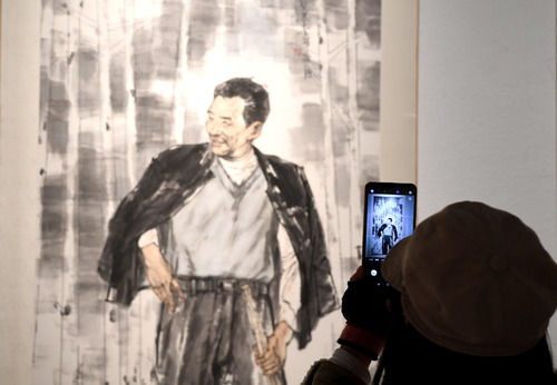 2019年11月27日,观众在河南省美术馆拍摄以焦裕禄为主题的美术作品。