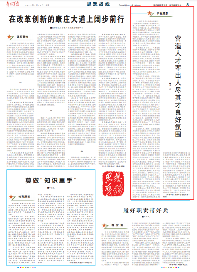 习主席在中共中央政治局第四十一次集体学习时强调:“要贯彻中央人才工作会议精神,做好中央军委人才工作会议下篇文章,深入实施新时代人才强军战略,更好发挥人才对强军事业的引领和支撑作用。”面对强军事业对人才队伍建设提出的现实需求,我们要深入学习领会习主席重要讲话精神,自觉强化识才、聚才、育才、用才的责任感使命感,用心用情用力营造人才辈出、人尽其才的环境氛围,为强军事业注入不竭动力。