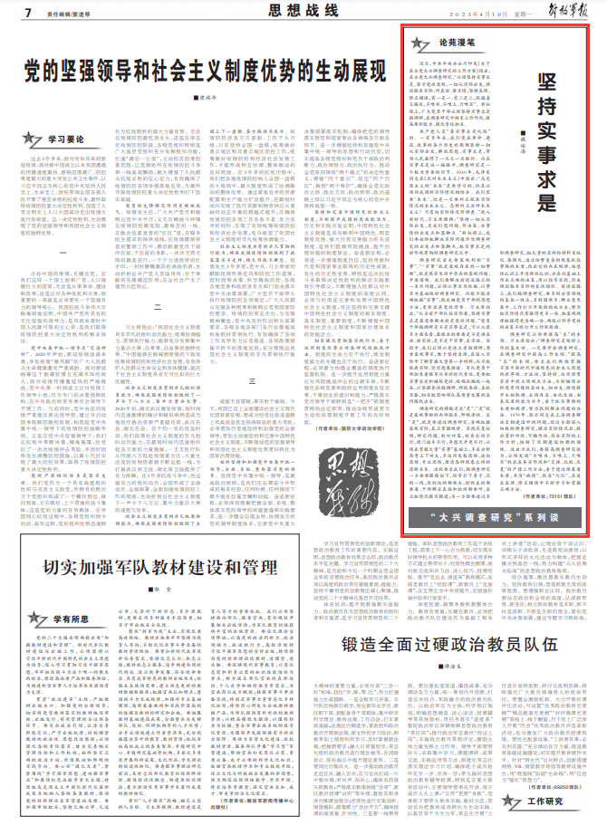调查研究首先要客观判断“实事”。“‘实事’就是客观存在的一切事物”,就是现实生活中存在的客观问题、矛盾困难。我们要解决前进道路上的一系列问题,必须以事实为依据、以事实为基础做好调查研究。而能不能准确把握“实事”,既反映党员干部的思想方法,更彰显其党性修养。习主席指出:“从当前干部队伍实际看,坚持实事求是最需要解决的是党性问题。”党员干部搞调研是不是实事求是,可以从很多方面来看,最根本的要看是不是讲真话、讲实话,是不是干实事、求实效。实践中,我们必须以党性立身搞调研,尊重客观事实,敢于坚持真理,在深入实际中了解掌握大量第一手材料,而不能脱离实际、凭空想象捏造。军队党员干部担负着强军兴军的时代重任,更要把实事求是和锤炼党性、砥砺品格统一起来,以坚强党性搞调研,研战务战、真抓实备,切实把影响部队高质量发展的真问题找出来。