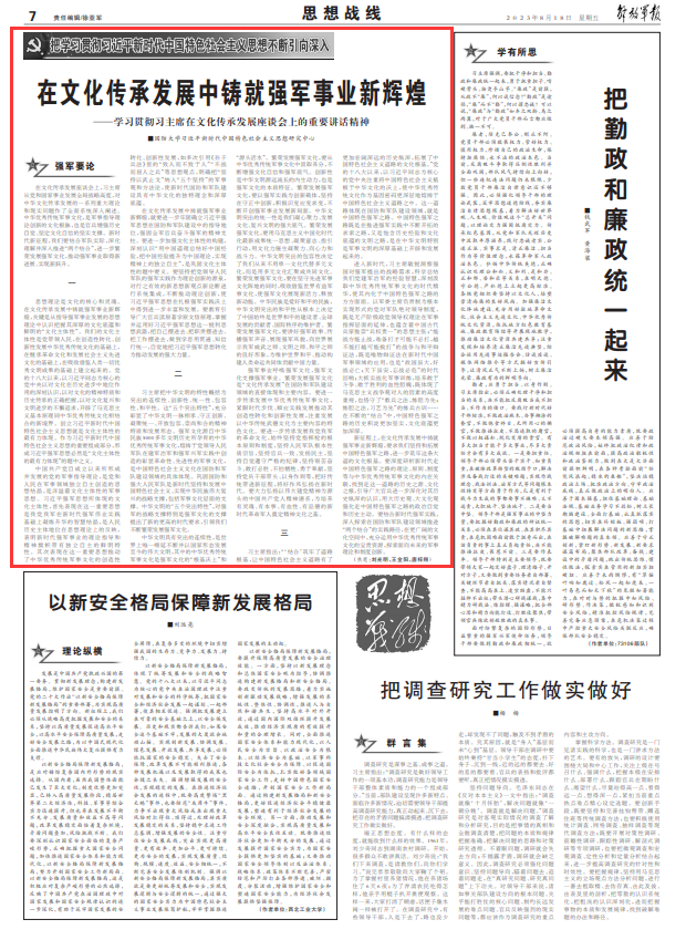在文化传承发展座谈会上,习主席从党和国家事业发展全局战略高度,对中华文化传承发展的一系列重大理论和现实问题作了全面系统深入阐述。中华优秀传统军事文化,是军事指导理论创新的文化根脉,也是官兵增强历史自觉、坚定文化自信的坚实支撑。新时代新征程,我们要结合军队实际,深化理解并深入推进“两个结合”,进一步繁荣发展强军文化,推动强军事业取得新进展、实现新跃升。