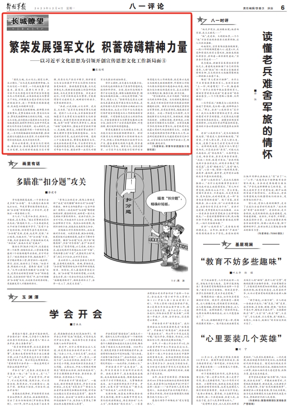 “兵者,以武为植,以文为种。武为表,文为里。”我军历来重视军事文化建设。党的十八大以来,全军各级坚决贯彻落实习主席有关打造强军文化的重要论述,坚持用党的创新理论凝心聚魂,培养“四有”新时代革命军人,锻造“四铁”过硬部队,塑造全军官兵的中国心、民族魂、强军志,为强军事业提供了强大精神力量和坚强思想保证。文化是时代的号角,也是时代的呼唤。党的二十大报告要求,繁荣发展强军文化。这充分体现出党中央、习主席对军队文化建设的高度重视,反映出实现建军一百年奋斗目标、建设世界一流军队对强军文化提出的迫切要求。