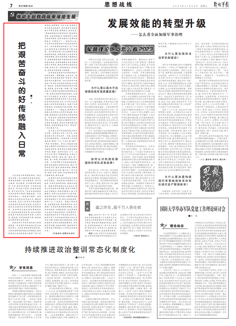 在建章立制中保证艰苦奋斗精神的常态落实。把艰苦奋斗精神长久立起来,必须完善规章制度、构建长效机制。要紧扣部队备战打仗主责主业,聚焦工作作风等突出问题,领导干部带头把自己摆进去、把职责摆进去、把工作摆进去,在带头自我剖析中立身为旗,带领部队把学习艰苦奋斗精神的好做法好经验固化下来,转化为制度成果,推而广之、广而用之。要建立奖惩制度,注重典型引路,形成鲜明导向,充分调动广大官兵吃苦耐劳的积极性、主动性和创造性,对铺张浪费、追求奢侈的行为进行严肃批评教育,对贪图享乐、好逸恶劳的行为予以坚决制止和纠正,切实引导广大官兵把艰苦奋斗的行为变成习惯;要建立健全监督机制,及时发现和纠正部队出现的奢靡享乐、作风虚浮等问题,在相互监督、相互帮助中让艰苦奋斗精神融入工作和生活的各方面。