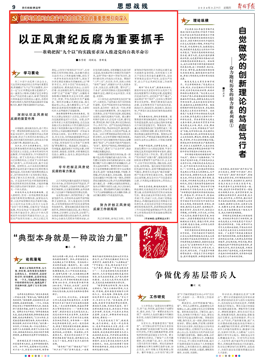 在二十届中央纪委三次全会上,习主席深刻阐述党的自我革命的重要思想,明确提出“九个以”的实践要求,其中之一是“以正风肃纪反腐为重要抓手”。这一重要指示精神,明确了坚定不移全面从严治党的着力重点,彰显了把党的自我革命进行到底的决心意志,为新时代新征程深入推进党风廉政建设和反腐败斗争,提供了根本遵循和行动指南。