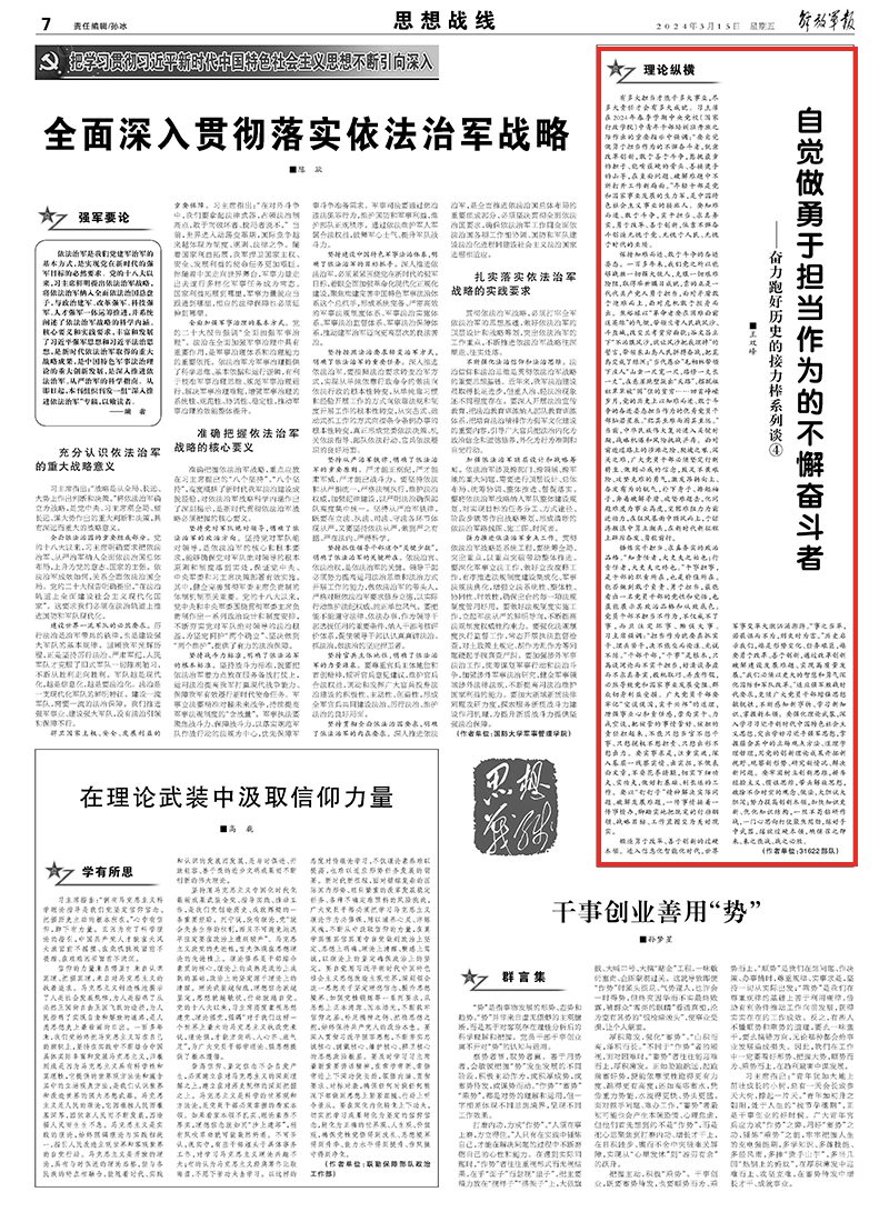 锻造勇于改革、善于创新的过硬本领。进入信息化智能化时代,世界军事变革大潮汹涌澎湃。“事之当革,若畏惧而不为,则失时为害。”历史启示我们,越是形势变化、任务艰巨,越要勇于改革、善于创新,通过改革创新破解建设发展难题、实现高质量发展。“我们必须以更大的智慧和勇气深化国防和军队改革。”适应强军胜战时代要求,更须广大党员干部增强思想敏锐性,不断感知新事物、学习新知识、掌握新本领。要强化理论武装,深入学习习近平新时代中国特色社会主义思想,突出学好习近平强军思想,掌握蕴含其中的立场观点方法、道理学理哲理,用党的创新理论成果开拓新视野、观察新形势、研究新情况、解决新问题。要牢固树立创新思维,摒弃经验主义、惯性思维,带头解放思想,破除不合时宜的观念、做法,大胆试大胆闯;努力提高创新本领,加快知识更新、优化知识结构,一丝不苟钻研作战,一门心思向打仗聚焦用劲,练好手中武器,练就过硬本领,确保召之即来、来之能战、战之必胜。