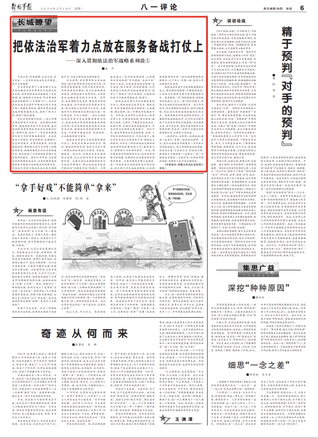 一流的军队,必然有一流的法治;建设一流军队,需要一流的法治保障。今天,我们正奋进在实现建军一百年奋斗目标的征途上,深入贯彻依法治军战略,筑法治之基、行法治之力、积法治之势,激活战斗力建设的“一池春水”,就一定能把我军建成一支能打仗、打胜仗的精兵劲旅,向党和人民交出合格答卷。