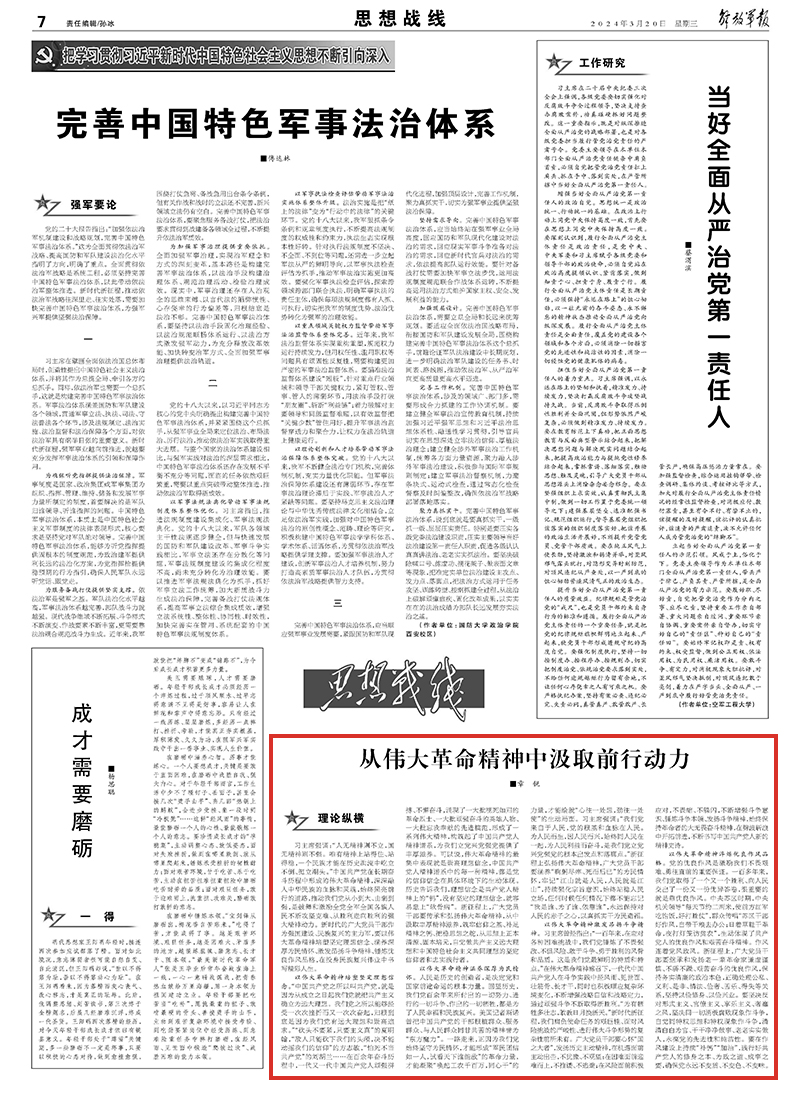 习主席强调:“人无精神则不立,国无精神则不强。唯有精神上站得住、站得稳,一个民族才能在历史洪流中屹立不倒、挺立潮头。”中国共产党在长期奋斗历程中形成的伟大革命精神,深深融入中华民族的血脉和灵魂,始终照亮前行的道路,推动我们党从小到大、由弱到强,是鼓舞和激励全党全军全国各族人民不断攻坚克难、从胜利走向胜利的强大精神动力。新时代的广大党员干部作为强国建设、民族复兴的主力军,要以伟大革命精神培塑坚定理想信念、涵养深厚为民情怀、激发昂扬斗争精神、锤炼优良作风品格,在投身民族复兴伟业中书写精彩人生。