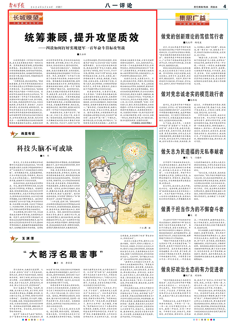 既要整体推进,又要重点突破。习主席指出:“在整体推进的基础上抓主要矛盾和矛盾的主要方面,采取有针对性的具体措施,努力做到全局和局部相配套、治本和治标相结合、渐进和突破相衔接,实现整体推进和重点突破相统一。”整体推进,才能统筹协调,把握大局;重点突破,才能以点带面,激发动力。提升攻坚质效,必须坚持把军队建设发展融入强国复兴大局,在全局中“谋全域”、在长远中“谋一程”。“十围之木,持千钧之屋;五寸之键,制开阖之门。”应坚持重点论和两点论相统一,在整体推进基础上把握重点突破,以重点突破带动整体发展提升。比如,在深化改革上,扭住落一子而全盘活的改革用力;在军事创新上,紧紧抓住科技创新这个“牛鼻子”;在战略管理上,加快推进以效能为核心的军事管理革命;在勤俭建军上,从严控制部队建设运行成本,等等。