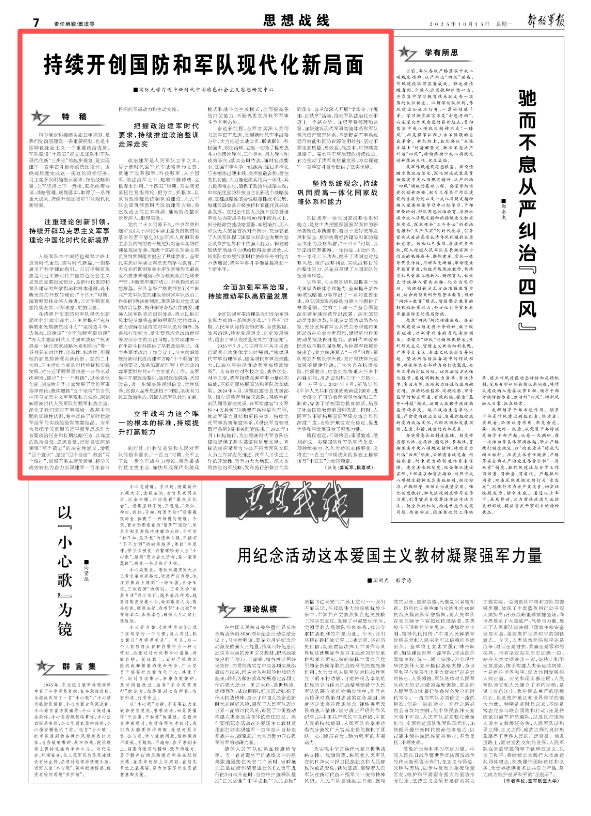 在持续开创国防和军队现代化新局面的壮阔实践中,习主席提出“充分解放和发展新质战斗力”“坚持边斗争、边备战、边建设”“全面加强军事治理”“深入实施新时代人才强军战略”“巩固提高一体化国家战略体系和能力”等一系列具有时代性、创造性、标志性、引领性的新思想新观点新论断。党的二十大后,习主席结合新的时代特征和实践发展,对习近平强军思想进一步作出系统阐发,提出“十一个明确”,以体系性创新、创造性升华丰富发展了党的军事指导理论;提炼概括“五个坚持”的当代中国马克思主义军事观和方法论,深刻阐明新时代人民军队的强军胜战之道,深化了我们党对军事领域一些基本问题的规律性认识,集中反映了新时代建军治军的实践经验和智慧结晶。全军官兵把学习贯彻习近平强军思想作为首要政治任务和长期战略任务,以高度的政治自觉、思想自觉、行动自觉深刻领悟“两个确立”的决定性意义,增强“四个意识”、坚定“四个自信”、做到“两个维护”,贯彻军委主席负责制,将学习成效转化为奋力实现建军一百年奋斗目标的不竭动力和生动实践。