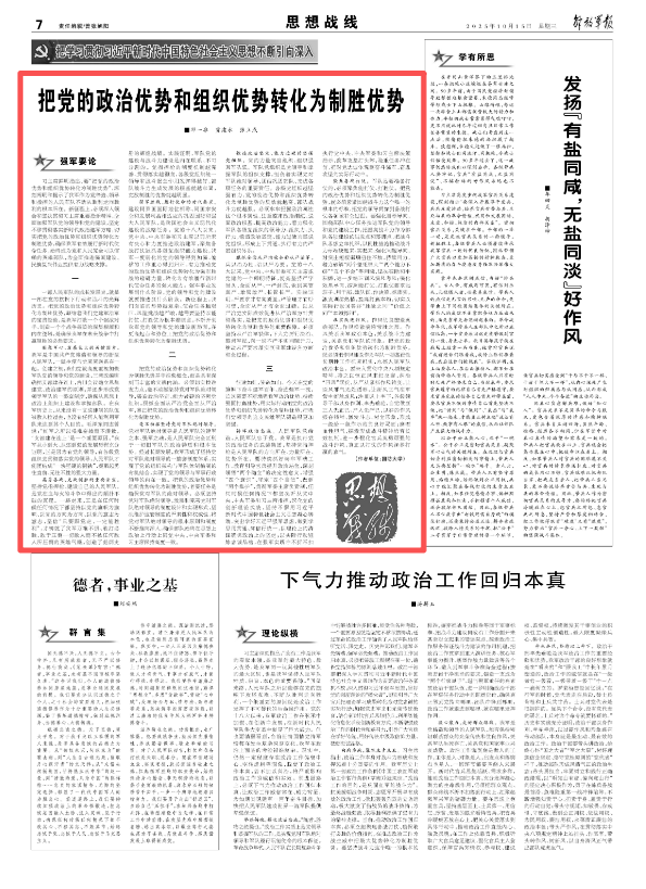 把党的政治优势和组织优势转化为制胜优势并非抽象概念,而是具有深刻而丰富的实践内涵。必须切实找准发力点,毫不动摇坚持党对军队绝对领导,锻造政治坚定、能力过硬的坚强党组织,狠抓全面从严治党全面从严治军,真正把党的政治优势和组织优势转化为制胜优势。