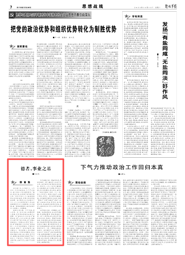 国无德不兴,人无德不立。古今中外,凡有所成就者,无不严以修身、德行高尚。《菜根谭》有言:“德者,事业之基,未有基不固而栋宇坚久者。”这告诉我们,个人的道德修养如同房屋地基,是事业稳固发展的前提。我们要充分认识道德之于个人、之于社会的重要意义,把加强道德修养作为十分重要的人生必修课,勤于修炼道德操守,做到私德润身、公德善心、大德铸魂。