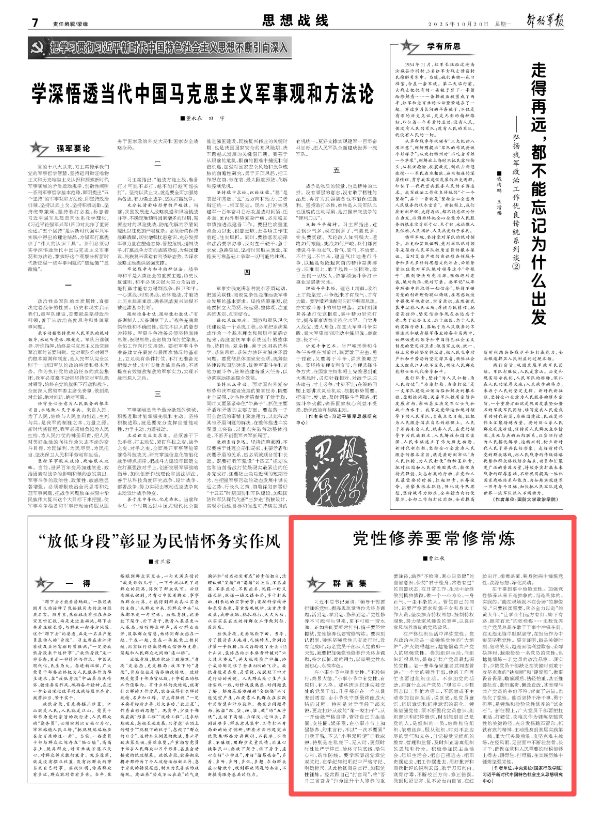 在小事小节中涵养党性。“不矜细行,终累大德。”小事小节中有党性、有原则、有人格。那些因违纪违法被查处的党员干部,几乎都存在一个从量变到质变、由小节失守到最终酿成大错的过程。特别是对于年轻干部来说,更应扣好从政的“第一粒扣子”,从一开始就严格自律,管好自己的生活圈、交往圈、娱乐圈,在小事小节上加强修养、约束言行,不以“一次不要紧”自我开脱、不以“小事无所谓”自我麻痹,特别是在私底下、无人时,更须时时处处严于律己,始终守住底线、稳住心神、筑牢防线。要学深悟透党章党规党纪,在学纪知纪明纪中严格守纪、明确标尺,以此检视自身言行,加强党性锤炼。经常跟自己“打官司”,将“吾日三省吾身”作为提升个人修养的重要途径,涵养“不检束,则心日恣肆”的自省意识,保持“君子检身,常若有过”的自警状态,在日常工作、生活中始终做到慎独慎微,做一个一心为公、一身正气、一尘不染的人。管住自己的同时,还要严格要求配偶子女和身边工作人员,坚决摒弃特权思想、抵制特权现象,努力做家风建设的表率,以良好家风涵养清朗的党风政风。