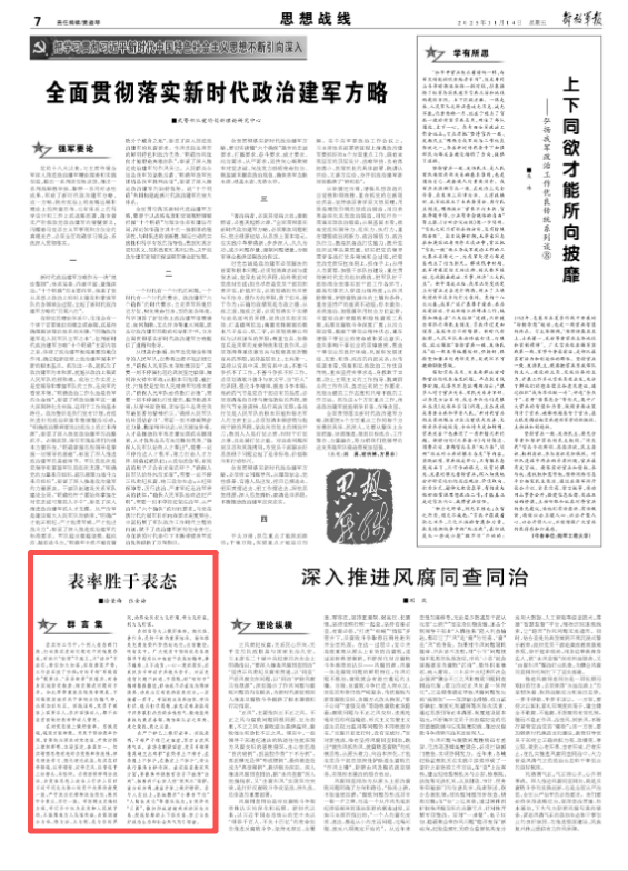 在实际工作中,个别人表态调门高、行动落实差的问题还不同程度存在,有的只“绘图”不施工,只“挂帅”不出征,看似如火如荼,实则虚张声势,工作甚至挂了空挡;有的干部“耳提面命”提要求、“层层部署”抓落实,而亲身实地督促检查、研究解决问题却不多。如此等等重表态轻表率现象,不同程度消减官兵干事创业的精气神,必须加以纠正。实践证明,党员干部在上面要求人,在后面推动人,都不如在前面做好表率带动人管用。