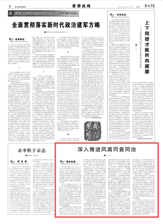 风清则气正,气正则心齐,心齐则事成。深入推进风腐同查同治,既是反腐败斗争的实践创新,也是全面从严治党、全面从严治军的必然要求。我们要始终保持战略定力,坚持查治贯通、标本兼治,下大气力斩断风腐勾连的链条,营造风清气正的政治生态和干事创业的良好氛围,为推进强国建设、民族复兴伟业提供有力作风保障。