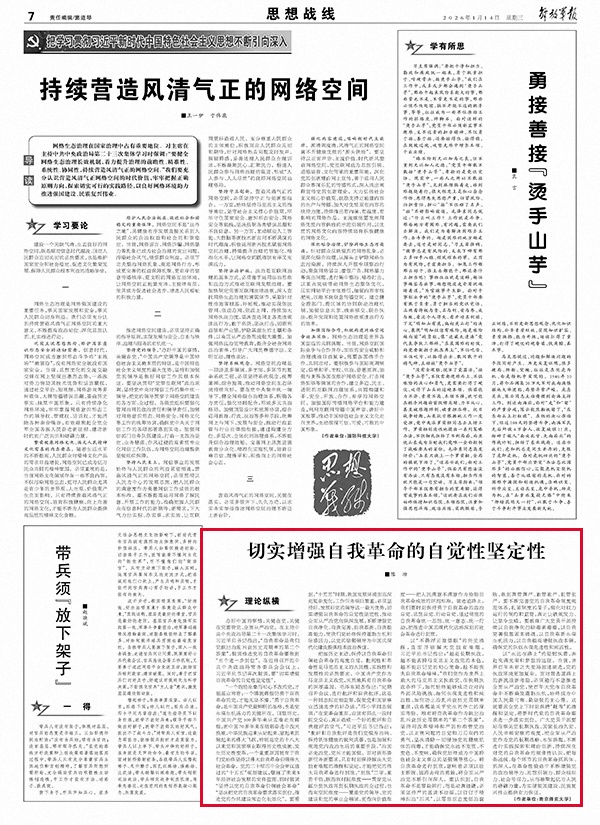 办好中国的事情,关键在党,关键在党要管党、全面从严治党。在主持中共中央政治局第二十一次集体学习时,习近平总书记指出,“自我革命是我们党跳出治乱兴衰历史周期率的第二个答案”,强调推进党的自我革命要做到“五个进一步到位”。在近日召开的中共中央政治局常务委员会会议上,习近平总书记再次强调,要“切实增强自我革命的自觉性坚定性”。