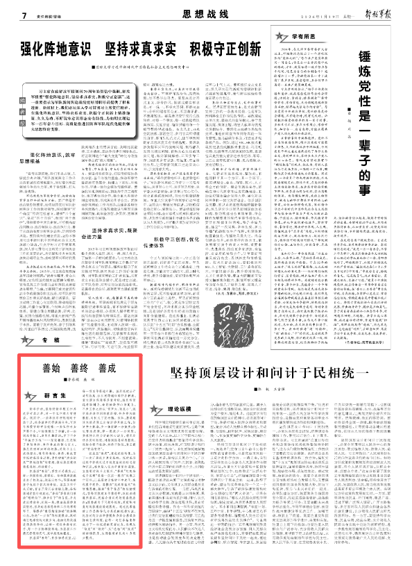 新年伊始,谋划好新年度工作并走好开局之路,对一年工作都大有裨益。现实中,一些单位年初规划时干劲十足,任务清单列得满满当当,可到年末收官却常留遗憾:一些工作开头声势不小,中途慢慢没了动静,另一些则浅尝辄止,没能扎根落地,留下不少“半截子工程”……深究根源,正是缺了善始善终、善作善成的恒心定力。基层是强军兴军的根基,是战斗力生成的源头,唯有将善始、善终、善成贯穿抓建基层全过程,才能破解“虎头蛇尾”“原地打转”的难题,推动基层建设稳扎稳打、持续提升。